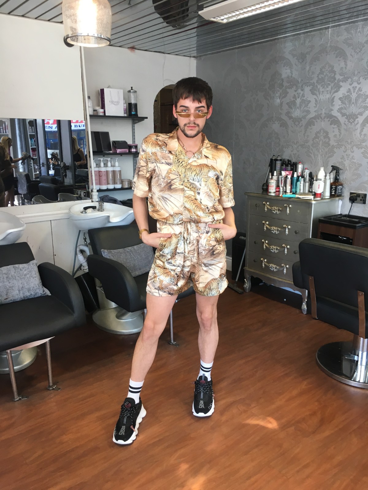 “ASOS, darling. Head to toe. I do like a chunky trainer.” He leans in and whispers, “these are Versace though. I love clothes and dressing up. It’s mostly ASOS. Sometimes my friends buy me stuff to wear.”