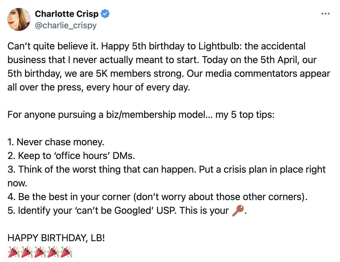 Happy 5th birthday, Lightbulb! And congrats to founder Charlotte on your big idea, which she describes as “an accidental business I never meant to start.”